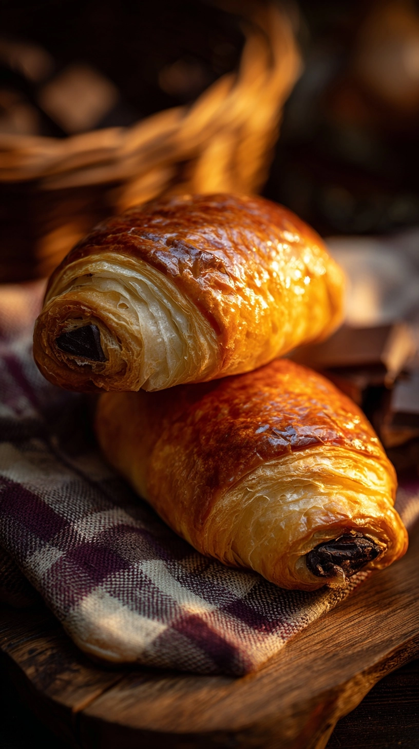 Unbaked, shaped croissants can be frozen on baking sheets, then transferred to freezer bags once solid. This allows you to bake fresh Pain Au Chocolat on demand—simply thaw overnight in the refrigerator, proof for 1 hour, and bake as directed. Leftover croissants can be refreshed by warming in a 350°F oven for 3-5 minutes, restoring their crispy exterior and tender interior.