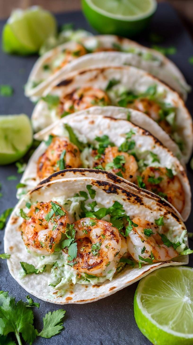 Layer each warm tortilla with cabbage slaw, 3-4 pieces of seasoned shrimp, sliced avocado, red onion, and a generous sprinkle of fresh cilantro. Finish with a dollop of Mexican crema and a squeeze of fresh lime juice for the ultimate flavor explosion.