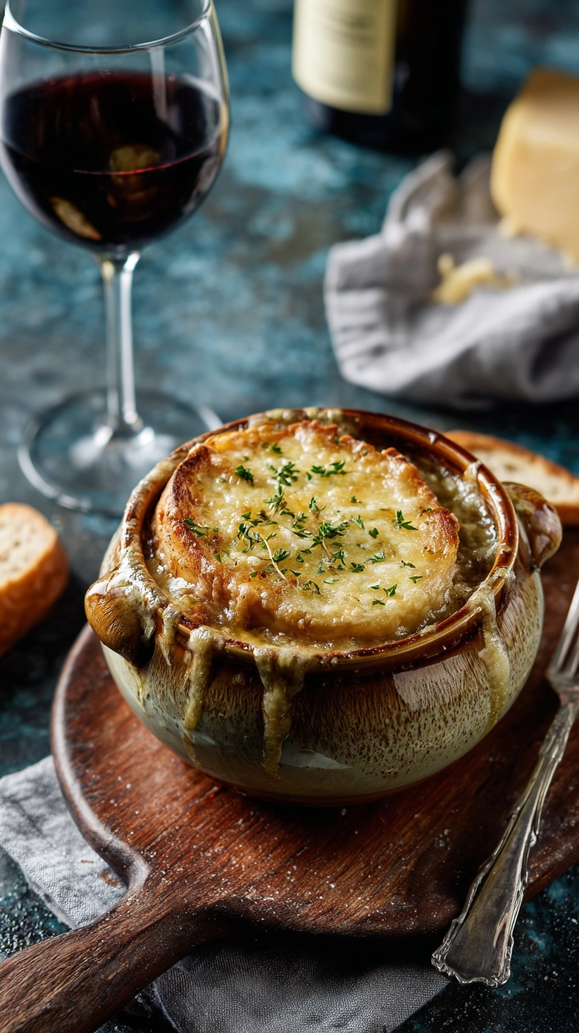 Elevate your French onion soup experience by pairing it with a crisp green salad featuring peppery arugula and tart vinaigrette to balance the rich, savory flavors. For dinner parties, serve in individual ramekins alongside crusty sourdough bread and herb butter.