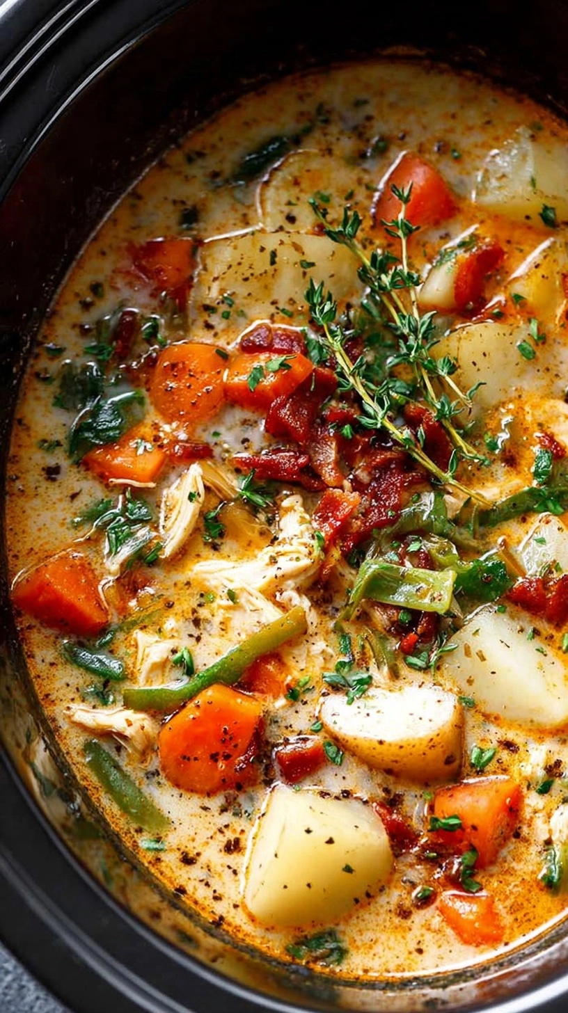 This hearty chicken and vegetable crockpot soup combines protein-rich ingredients with aromatic vegetables for a complete meal that serves 6-8 people generously: