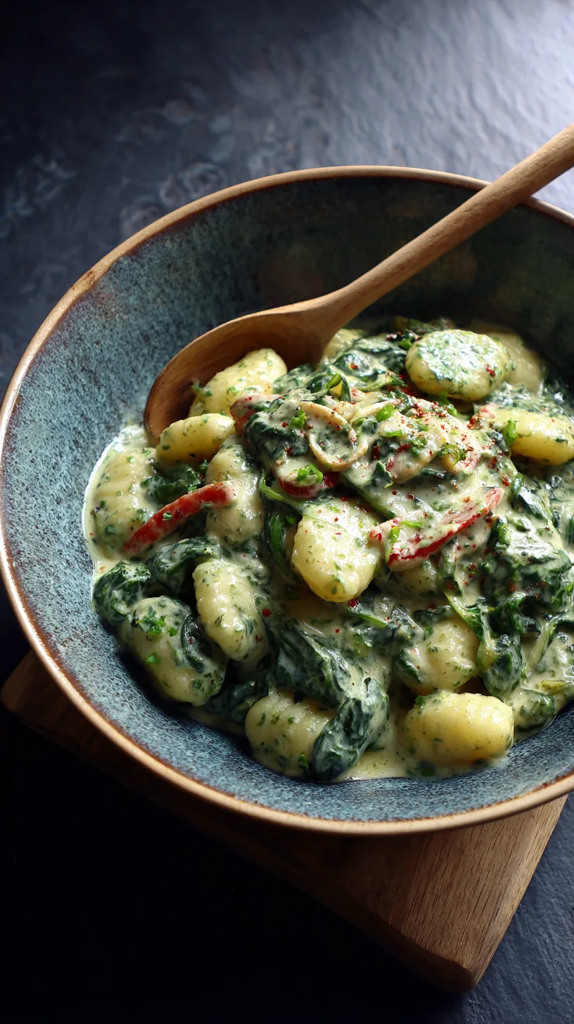 Taste your Creamy Pesto Gnocchi and adjust seasoning with freshly cracked black pepper. The dish should be creamy but not heavy, with bright pesto flavors balanced by rich dairy notes. Serve immediately in warmed bowls, topped with additional Parmesan and a light drizzle of high-quality olive oil.