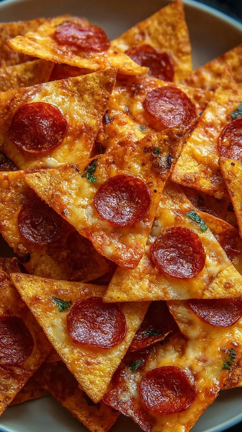 Sprinkle Italian seasoning and garlic powder over the sauce, followed by mozzarella and Parmesan cheeses. Distribute pepperoni pieces evenly, ensuring each chip gets its fair share of toppings.