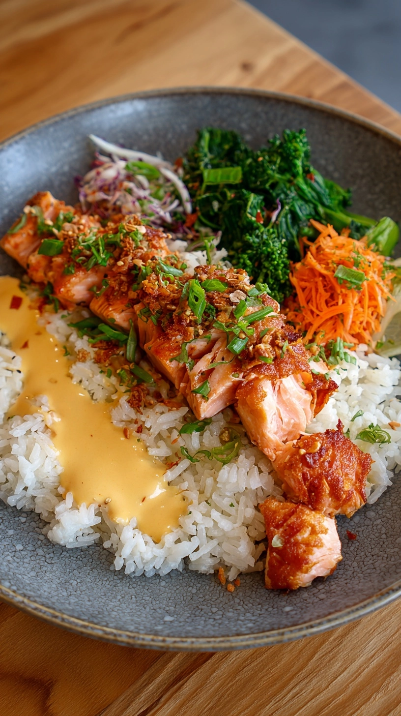 Elevate your Crispy Salmon & Rice Bowl by customizing toppings based on seasonal availability. Spring calls for pea shoots and radish slices, while summer welcomes corn kernels and bell peppers. Winter variations shine with roasted Brussels sprouts and pomegranate seeds.