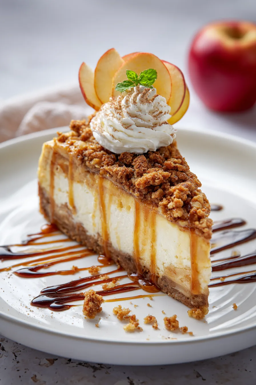 Elevate your Delicious Apple Crumble Cheesecake presentation with a drizzle of salted caramel sauce and a dollop of freshly whipped cream. For autumn gatherings, garnish with candied pecans and a light dusting of cinnamon. Pair with hot cinnamon tea or vanilla coffee for temperature contrast that enhances the dessert’s warm spices. Individual mini versions make stunning dinner party presentations—simply divide ingredients among 6-inch pans for perfectly portioned elegance.