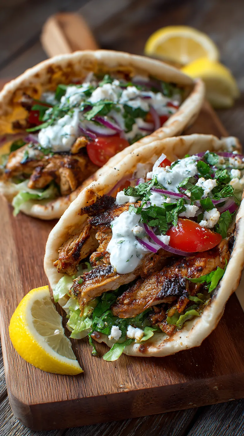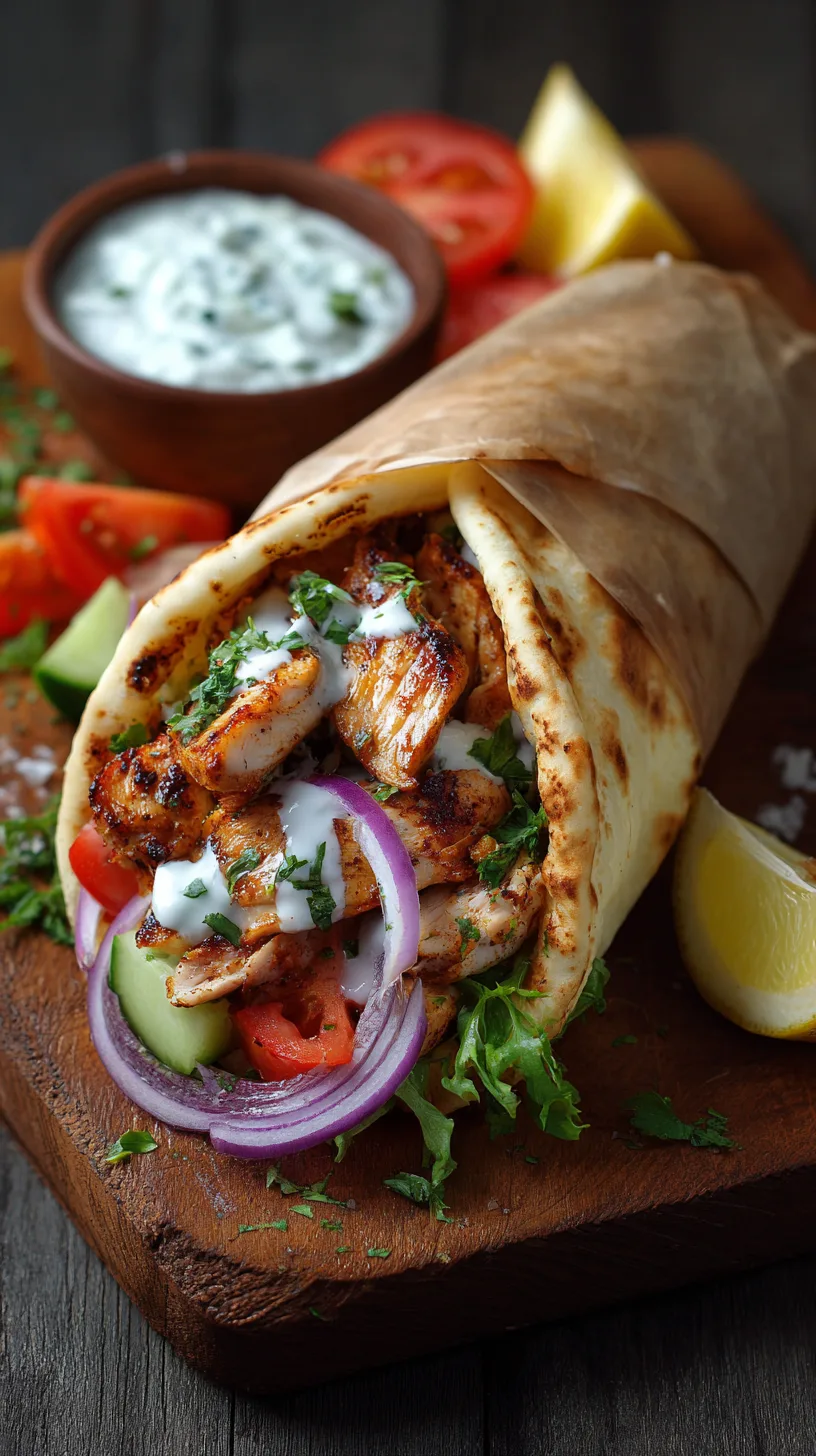 Spread generous tzatziki sauce on warm pita, layer with sliced chicken, fresh vegetables, and crumbled feta cheese. Roll tightly, securing with parchment paper if needed for easier handling.