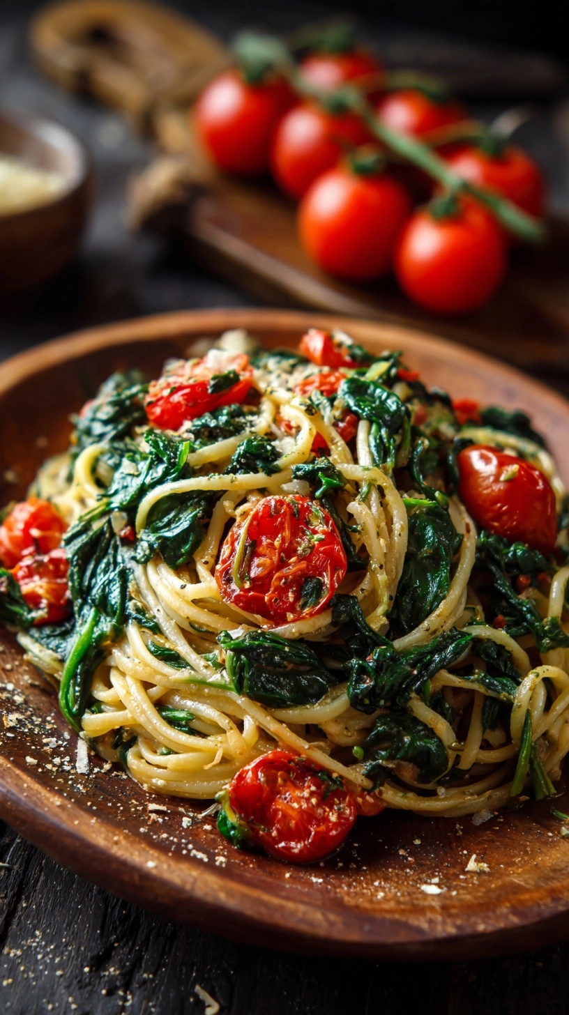 Transform your kitchen into an Italian trattoria with these carefully selected ingredients that create the perfect delicious spinach tomato pasta: