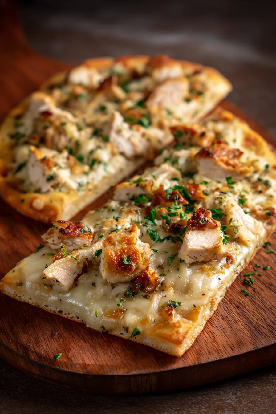 Serve your Chicken Alfredo Flatbread alongside a crisp Caesar salad or roasted vegetables for a complete meal. Cut into triangular slices for easy sharing at parties, or serve whole for individual dinners. Pair with sparkling water infused with lemon or a refreshing iced tea. For entertainment purposes, create a flatbread bar where guests can customize their toppings—provide bowls of extra herbs, different cheeses, and vegetable options.