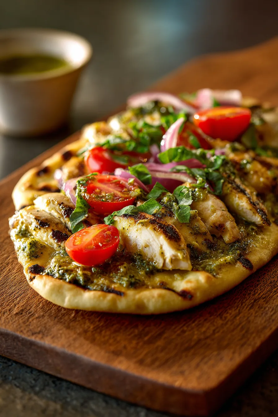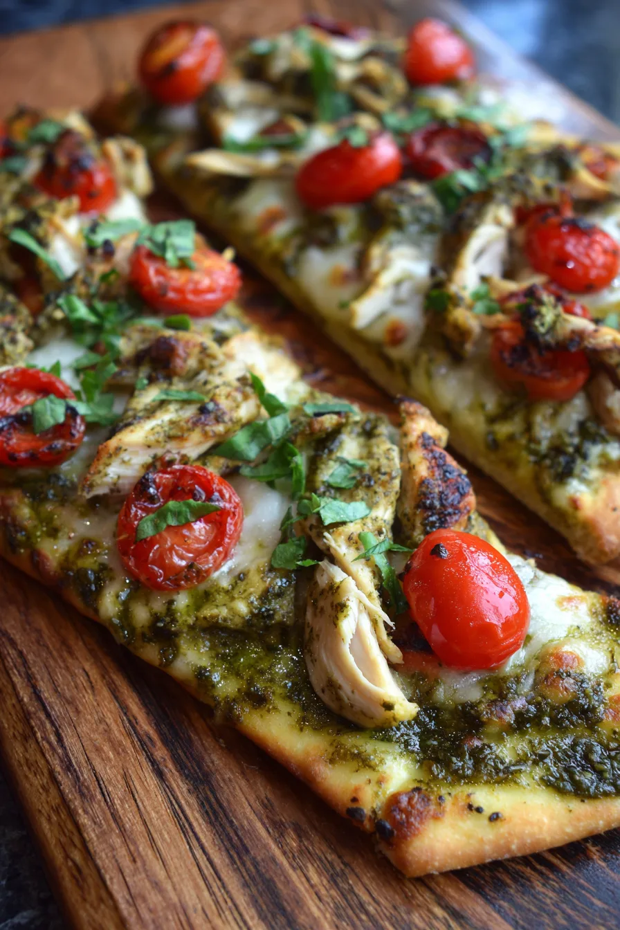 Store leftover Pesto Chicken Flatbread in refrigerator for up to 3 days wrapped in aluminum foil. Reheat in a 350°F oven for 5-7 minutes to restore crispiness – avoid microwaving, which creates soggy textures. Prepare pesto up to 1 week in advance and store in refrigerator with plastic wrap pressed directly against surface to prevent oxidation. Cooked chicken can be prepared 2 days ahead and stored separately, making final assembly quicker.