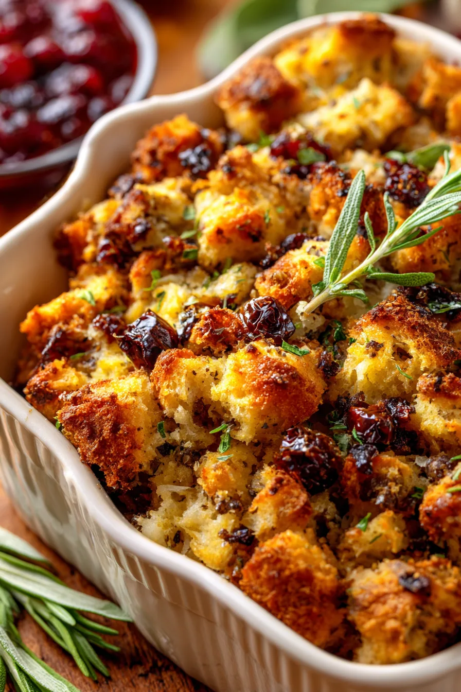 Present stuffing alongside classic Thanksgiving accompaniments like roasted turkey, cranberry sauce, and green bean casserole. For elegant presentation, use an ice cream scoop to create uniform portions, garnishing each serving with fresh herb sprigs.