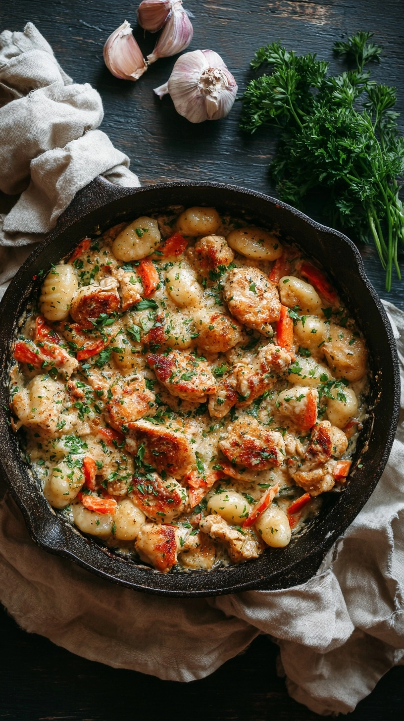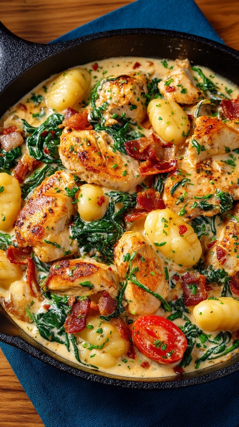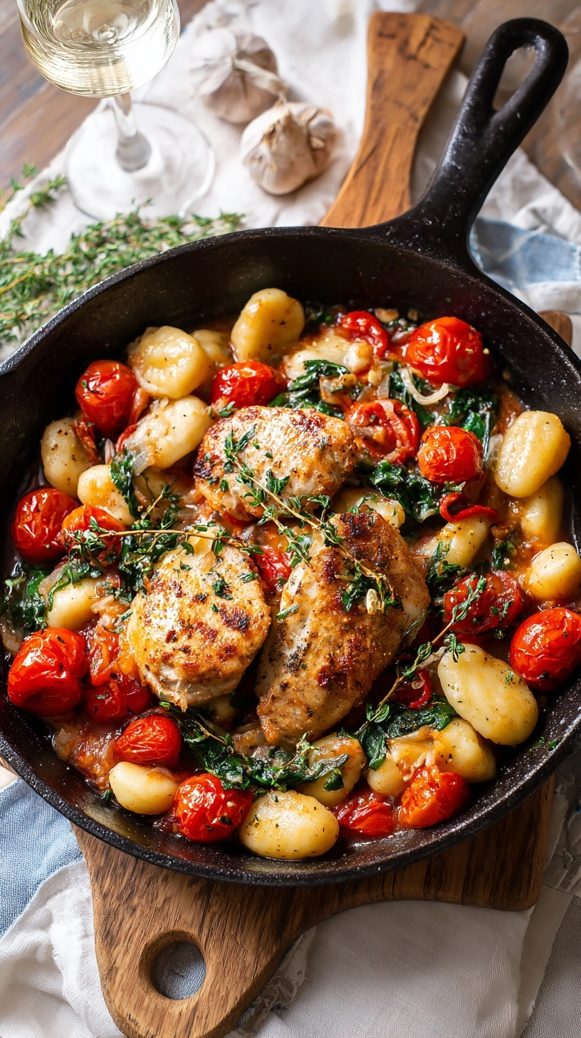 Add gnocchi directly to the simmering sauce along with the partially cooked chicken pieces. The gnocchi will cook in the flavorful liquid, absorbing the garlic and herb essence. Simmer for 8-10 minutes, stirring occasionally, until gnocchi are tender and the chicken reaches an internal temperature of 165°F. Fold in fresh spinach during the last 2 minutes, allowing it to wilt naturally.