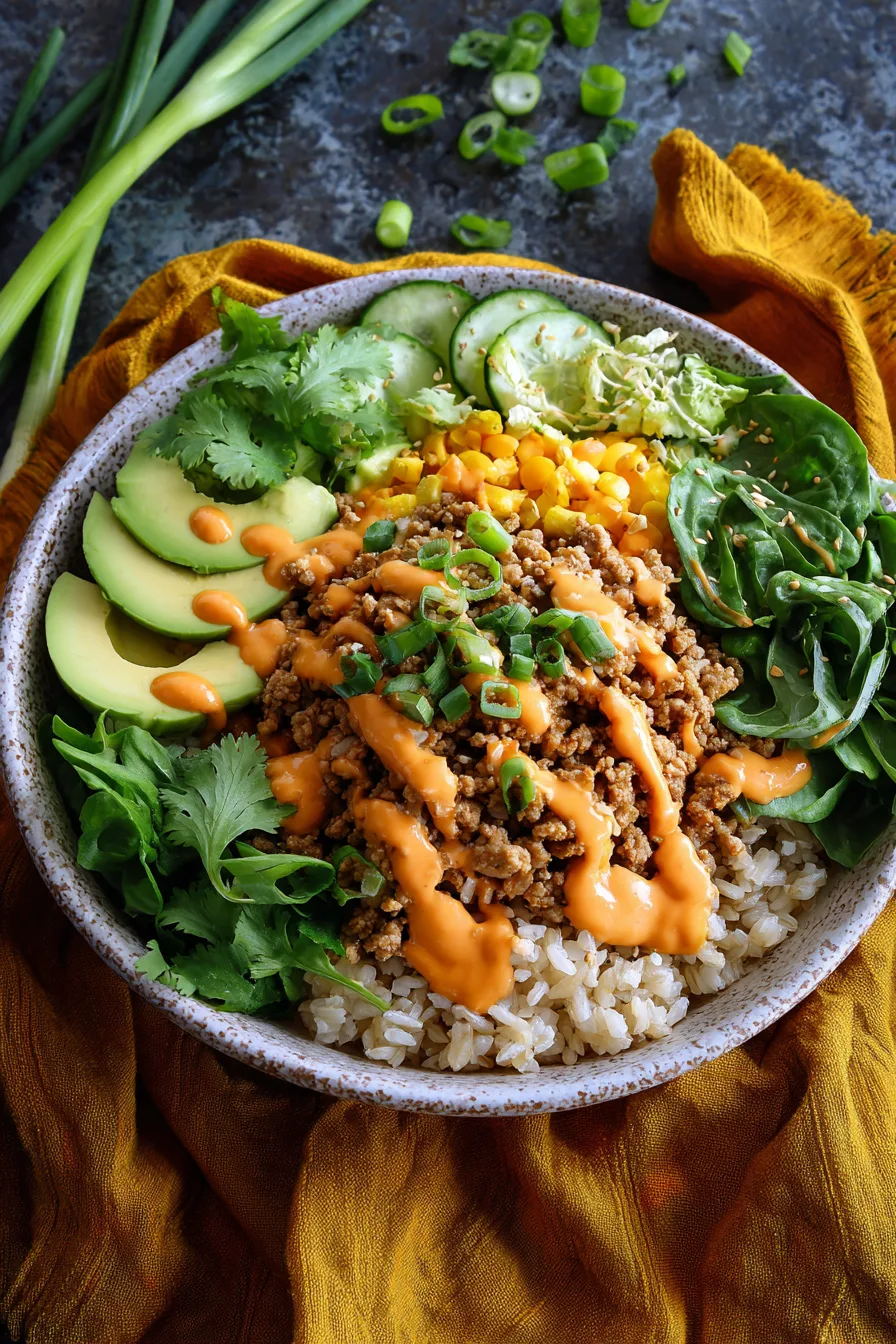 The most frequent error when making Ground Turkey Rice Bowls with Bang Bang Sauce is overcooking the ground turkey, which results in dry, flavorless protein. Monitor internal temperature carefully – turkey is done at 165°F, not a degree more. Another common pitfall involves making the bang bang sauce too thick; it should be pourable, not paste-like. Finally, avoid preparing fresh vegetables too far in advance, as they lose crispness and vibrant color that’s essential for visual appeal and textural contrast.