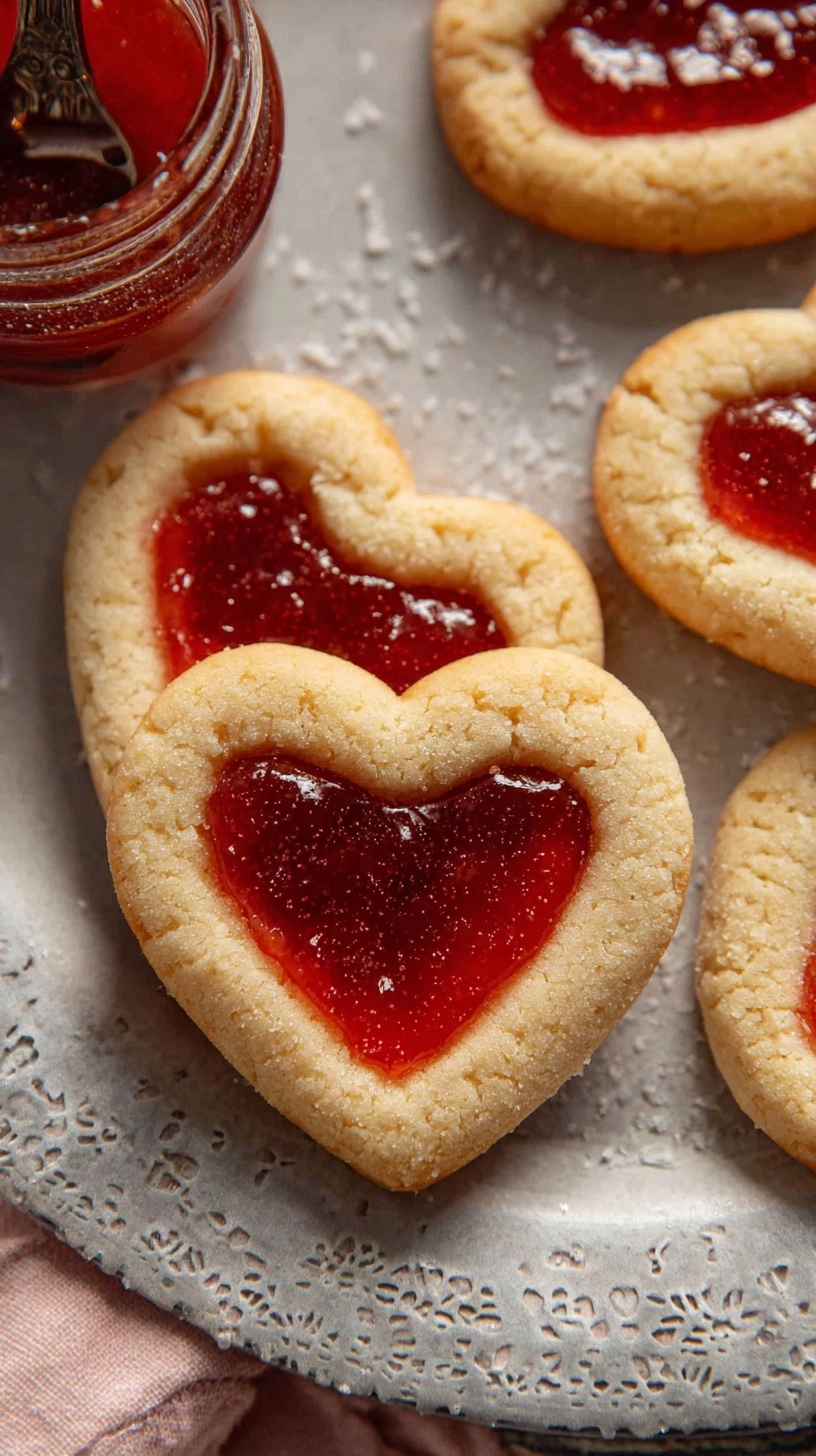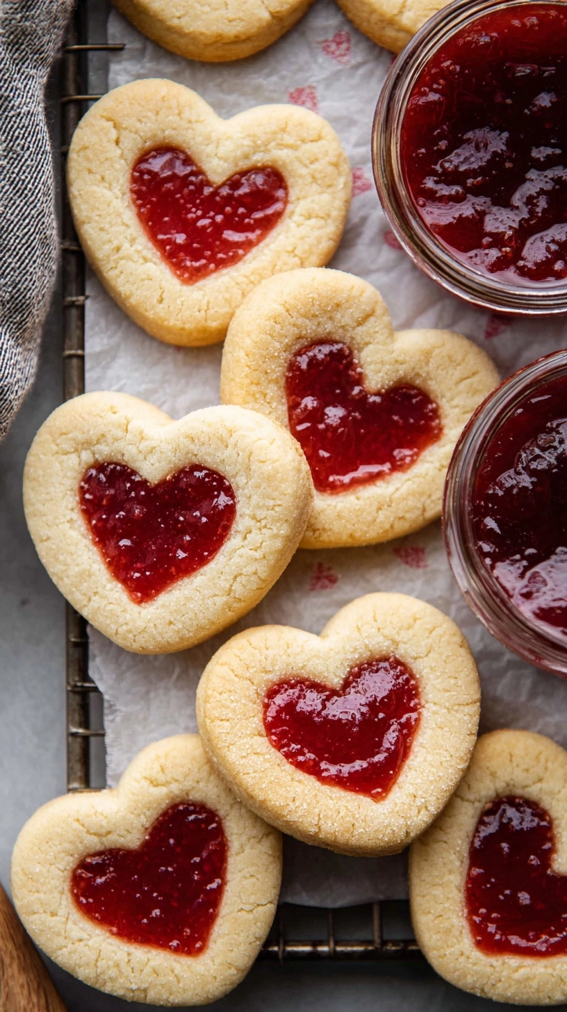 Present your Heart Jam Valentine Cookies as edible valentines by inserting popsicle sticks before baking, creating cookie pops perfect for gift-giving. Arrange them on tiered serving platters with fresh berries and mint garnishes for elegant presentation.