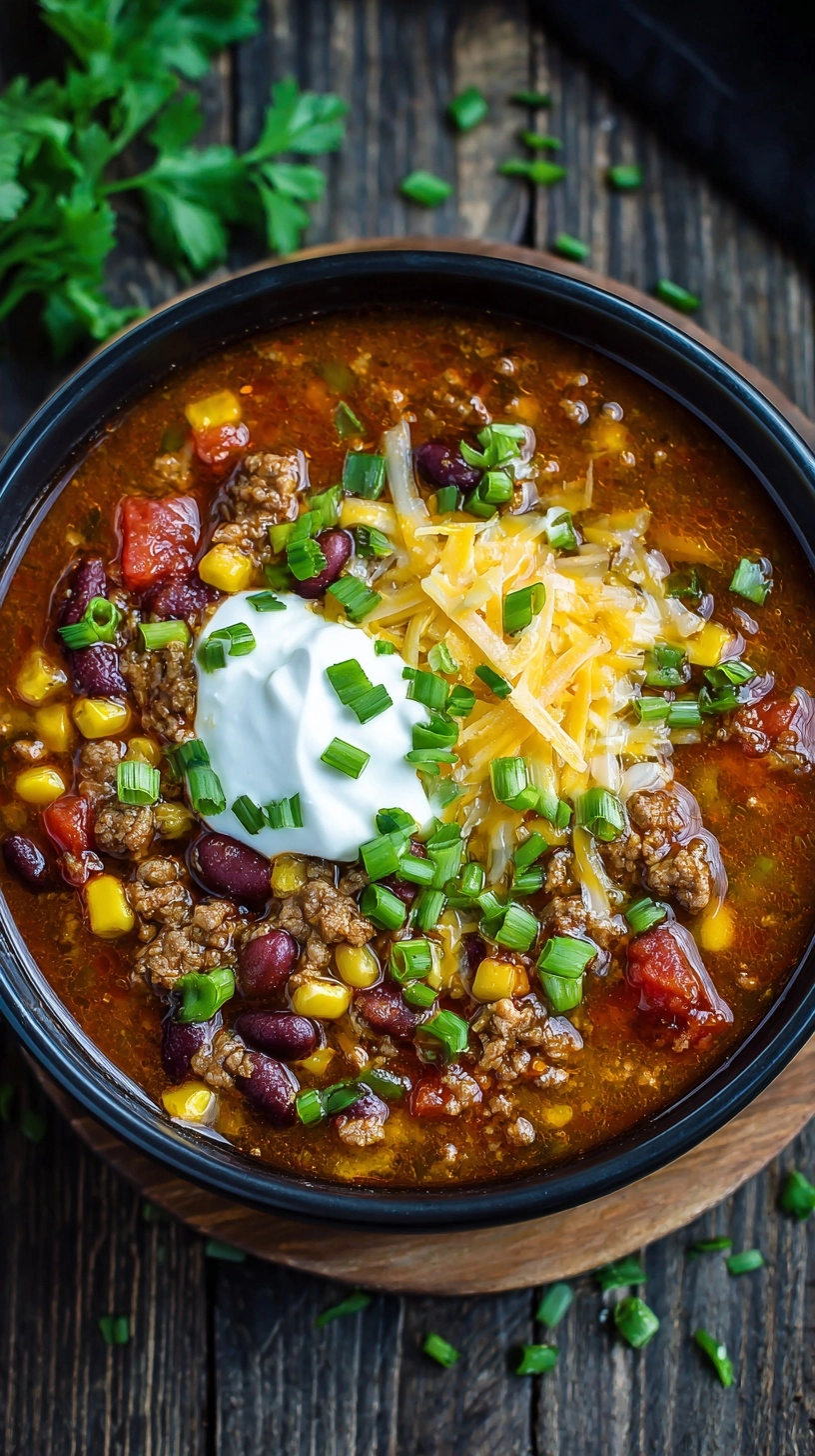 Elevate your Hearty Taco Soup presentation with creative serving ideas that transform a simple bowl into a memorable meal experience. Serve in pre-warmed bowls topped with a dollop of Greek yogurt instead of sour cream for added protein. Create a “taco soup bar” where family members can customize their bowls with fresh avocado slices, shredded cheese, crushed baked tortilla chips, and fresh cilantro. Pair with warm cornbread or quesadilla wedges for a complete comfort meal. For elegant entertaining, serve in bread bowls or alongside mini corn muffins. The soup also works beautifully over baked sweet potatoes or cauliflower rice for a low-carb option.
