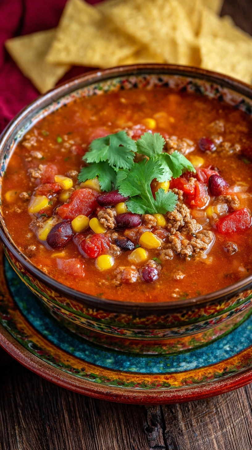 Maximize your Hearty Taco Soup enjoyment with proper storage techniques that preserve flavor and safety. Cool completely before refrigerating – this prevents bacterial growth and maintains optimal texture. Store in airtight containers in the refrigerator for up to 4 days. The soup actually improves overnight as flavors meld and deepen. For freezing, portion into freezer-safe containers leaving 1-inch headspace for expansion. Frozen soup maintains quality for up to 3 months. Thaw overnight in refrigerator before reheating. When reheating, add a splash of broth if needed to restore original consistency. Never leave soup at room temperature for more than 2 hours to ensure food safety.