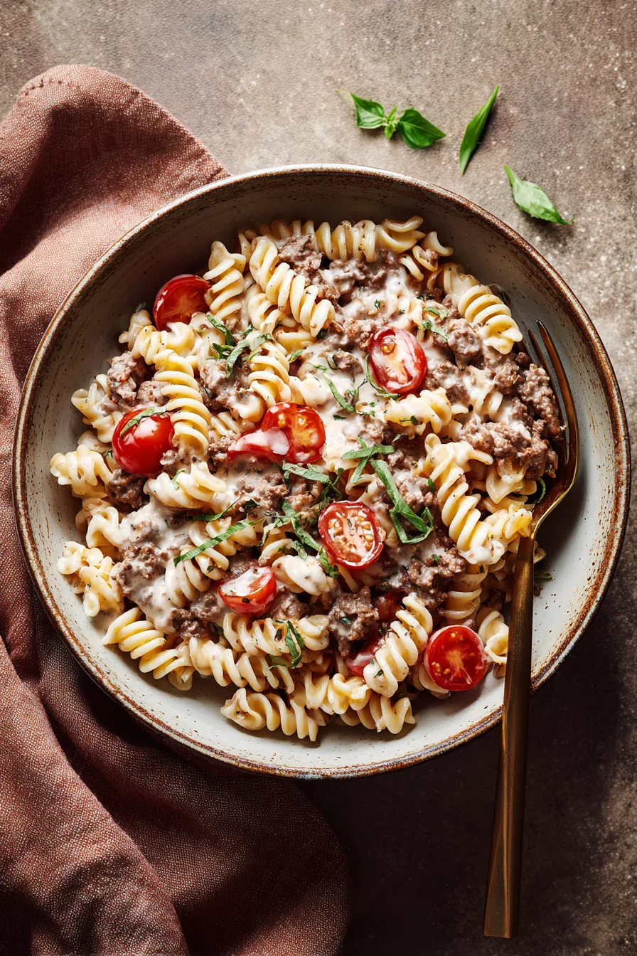 Drain cooked pasta, reserving 1/2 cup pasta water. Add pasta directly to the beef mixture, tossing gently. Use reserved pasta water as needed to achieve your preferred consistency—this starchy water helps bind everything together beautifully.
