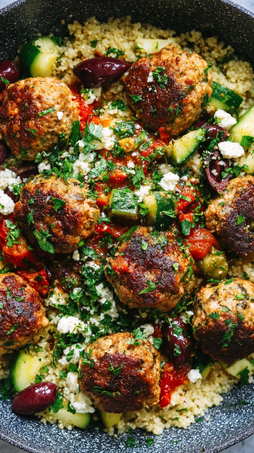 Add diced tomatoes, chicken broth, oregano, and red pepper flakes to the skillet. Simmer for 8-10 minutes until slightly thickened. Fold in olives, sun-dried tomatoes, and fresh basil. Gently nestle the baked meatballs into the sauce and simmer for 3-5 minutes to meld flavors.