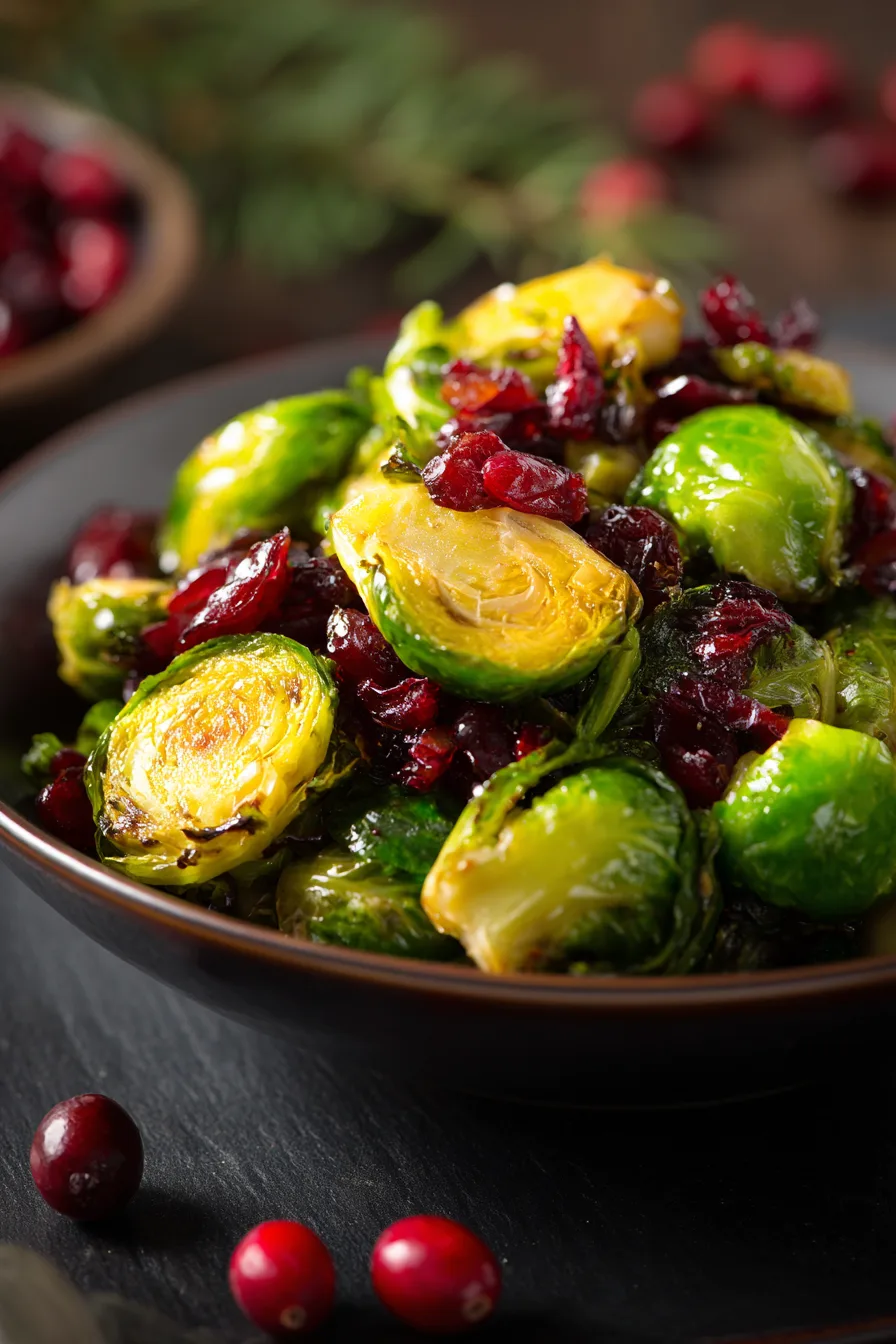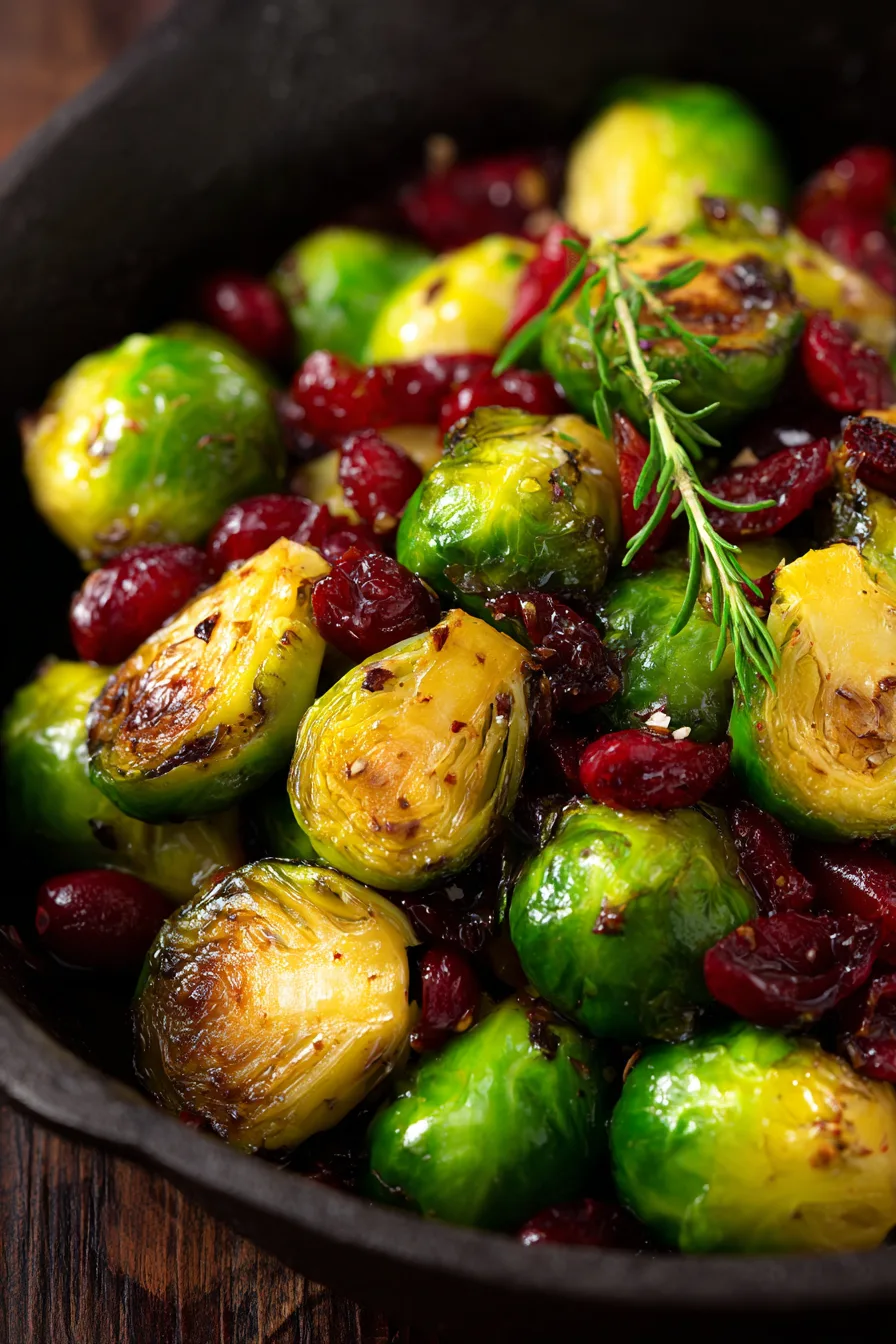 Transfer glazed Brussels sprouts to serving dish and immediately scatter dried cranberries, toasted pecans, and fresh thyme leaves over the hot vegetables. Drizzle with remaining glaze and top with crumbled goat cheese if desired. The residual heat will slightly soften cranberries and warm nuts for optimal texture contrast.