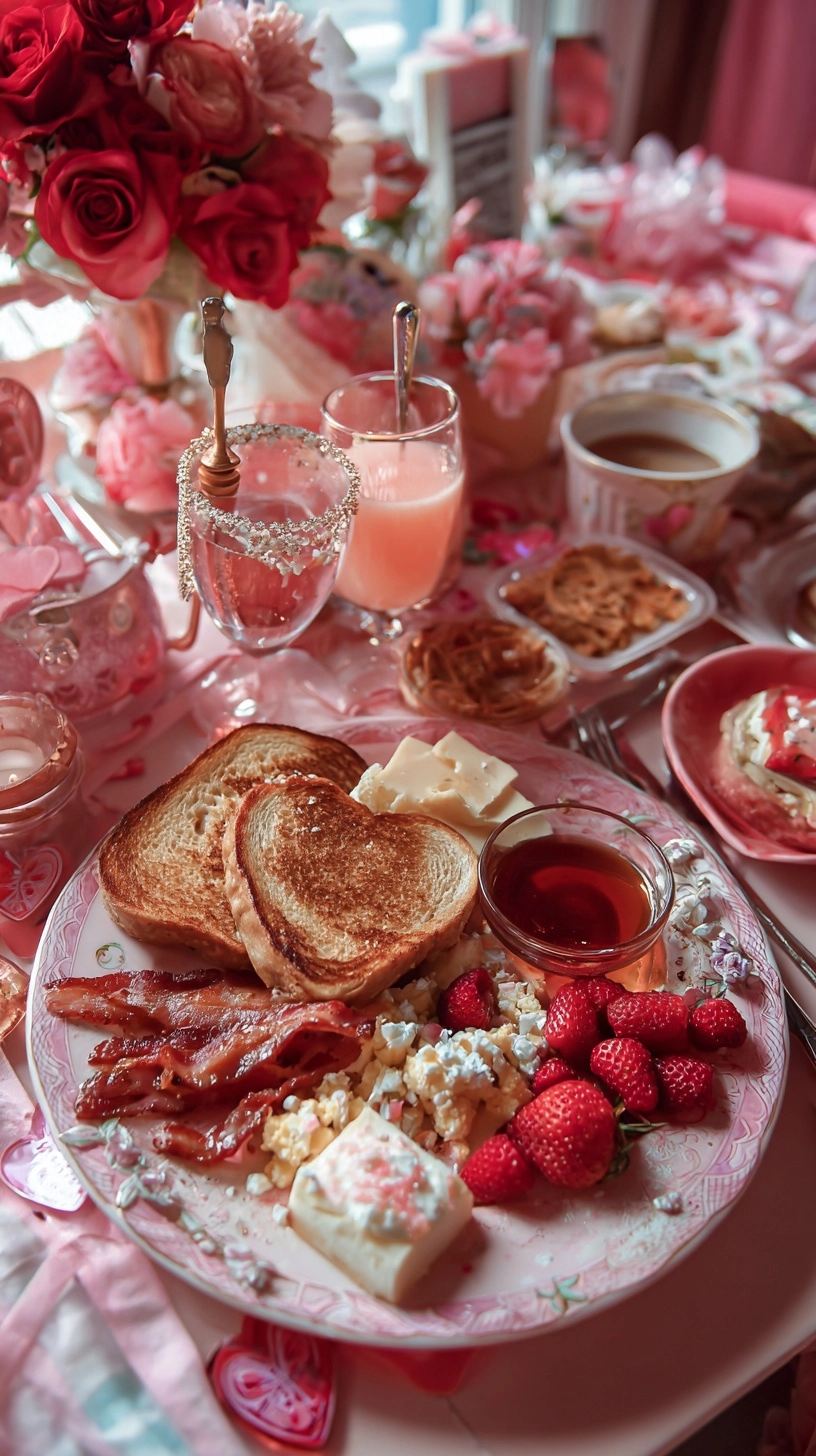 Present your Pink and Red Galentine’s Day Brunch – With Wonder and Whimsy on tiered stands with fresh roses and pink linens for maximum impact. Serve French toast triangles alongside smoothie bowls, allowing guests to sample both. Provide small spoons for the compote, encouraging drizzling creativity. Consider adding fresh whipped cream tinted with a drop of red food coloring for extra whimsy. Pair with herbal teas in vintage teacups or sparkling water with berry garnishes for a complete sensory experience.