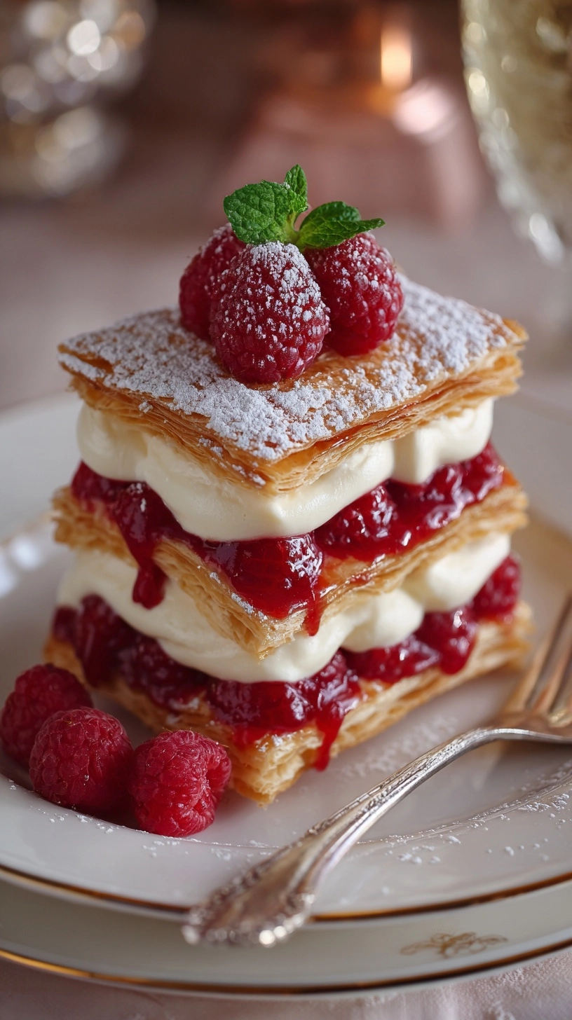 Romantic Plating: Dust plates with powdered sugar using a heart-shaped stencil, place napoleons at an elegant angle, and add fresh raspberry coulis dots for professional presentation.