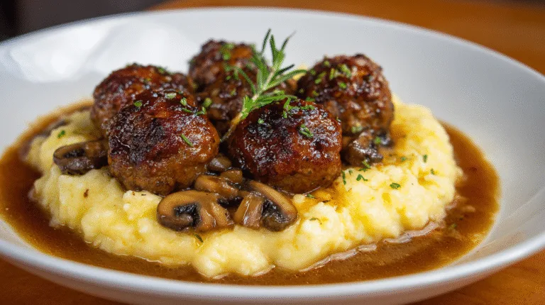 Experience the rich flavors of Salisbury Steak Meatballs With Garlic Herb Mashed Potatoes Recipe, packed with protein and fiber, perfect for your busy day.