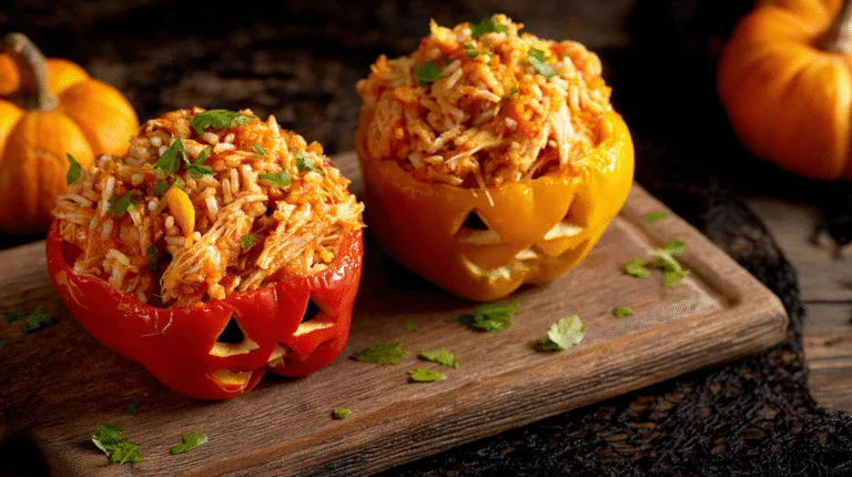 Experience the rich flavors of Spook Up Dinner with SHREDDED CHICKEN & RICE STUFFED PEPPERS (HALLOWEEN STYLE), packed with protein and fiber, perfect for your busy day.