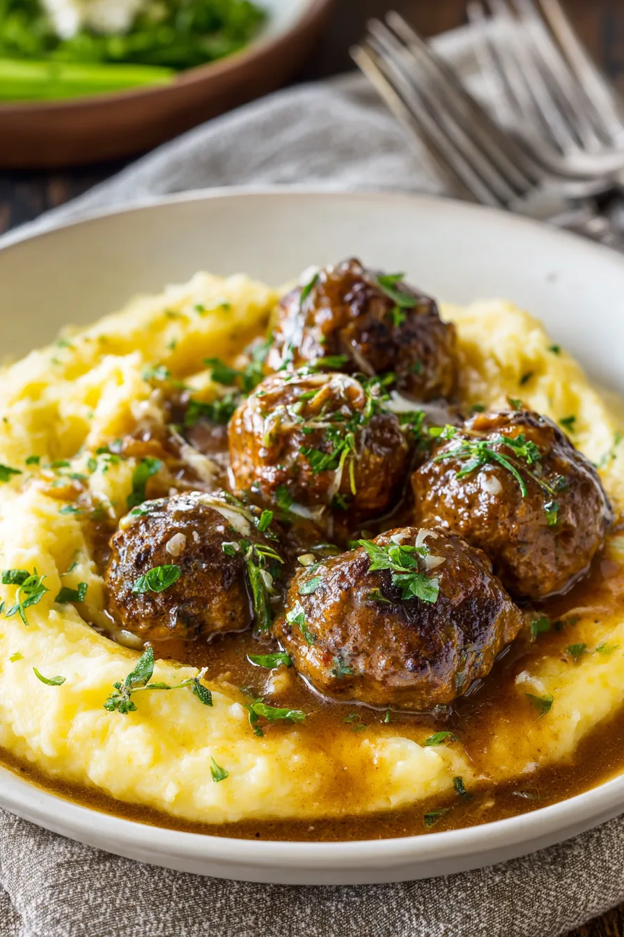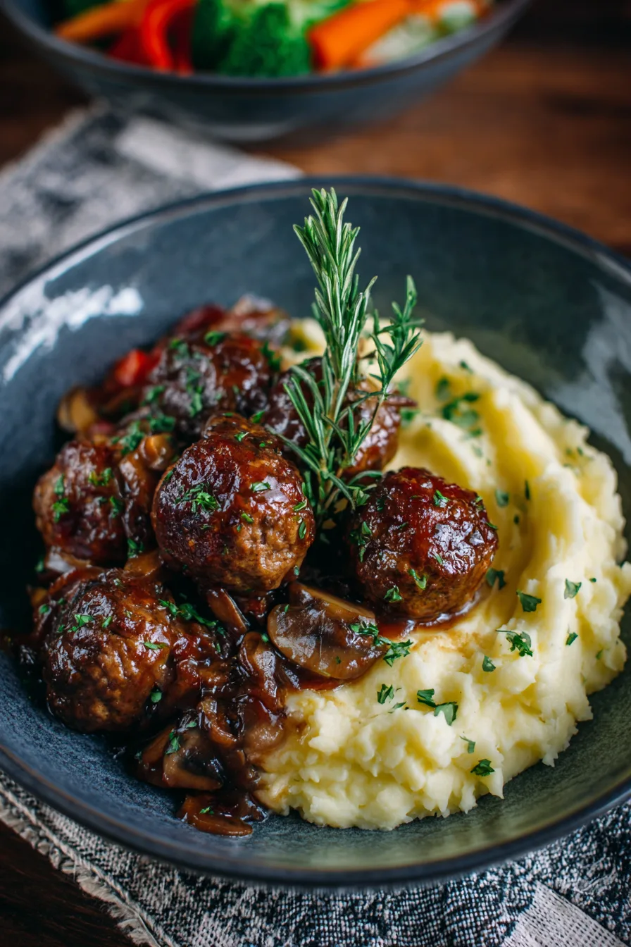 Present your Salisbury Steak Meatballs With Garlic Herb Mashed Potatoes family-style in a large, shallow serving bowl with meatballs nestled into fluffy potato clouds. Garnish with fresh parsley and a light dusting of paprika for visual appeal. Pair with steamed green beans, roasted carrots, or a crisp garden salad to complete the meal. Consider serving alongside dinner rolls or crusty bread for soaking up that incredible gravy.