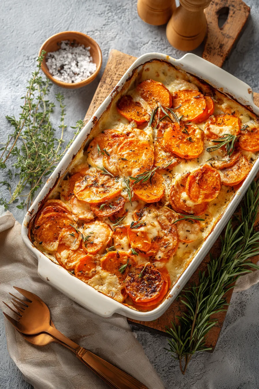 Elevate your scalloped sweet potatoes by pairing them with roasted turkey, grilled chicken thighs, or glazed ham for holiday gatherings. The dish’s natural sweetness complements savory proteins beautifully. For vegetarian meals, serve alongside roasted Brussels sprouts and cranberry sauce.