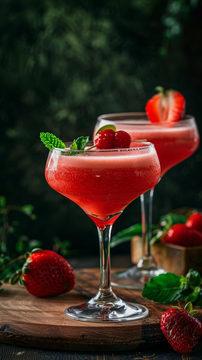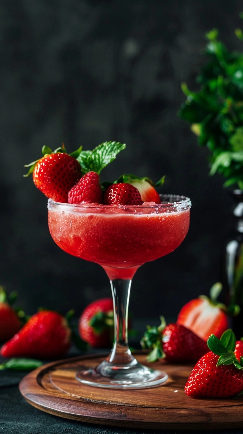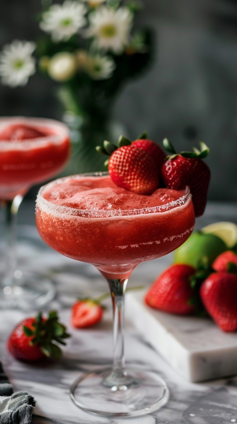 Elevate your strawberry daiquiri experience by serving it in salt-rimmed glasses with a mixture of sea salt and lime zest for a sophisticated twist. Create a beautiful presentation by garnishing with skewered fresh strawberries, mint sprigs, and lime wheels. For special occasions, serve in hurricane glasses with colorful paper umbrellas and striped straws. Consider creating a daiquiri bar setup where guests can customize their drinks with various fruit add-ins like mango chunks, pineapple pieces, or even fresh basil leaves. Pair this refreshing mocktail with light appetizers such as coconut shrimp, fresh fruit kabobs, or tropical-inspired salads for the perfect summer gathering menu.