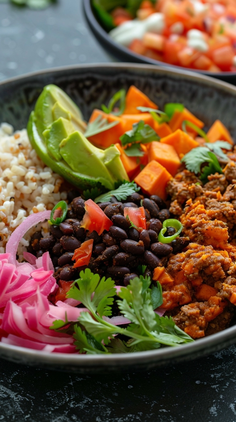 Divide the cooked brown rice among four serving bowls. Top each bowl with a generous portion of roasted sweet potatoes and seasoned black beans. Arrange the fresh toppings—sliced avocado, cherry tomatoes, red onion, and cilantro—in colorful sections around each bowl for visual appeal.