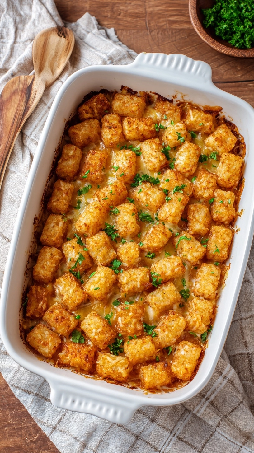 Present your tater tot casserole alongside a crisp green salad with vinaigrette to balance the richness. Steamed broccoli or roasted Brussels sprouts provide excellent textural contrast. For family gatherings, consider serving in individual ramekins for personalized portions.