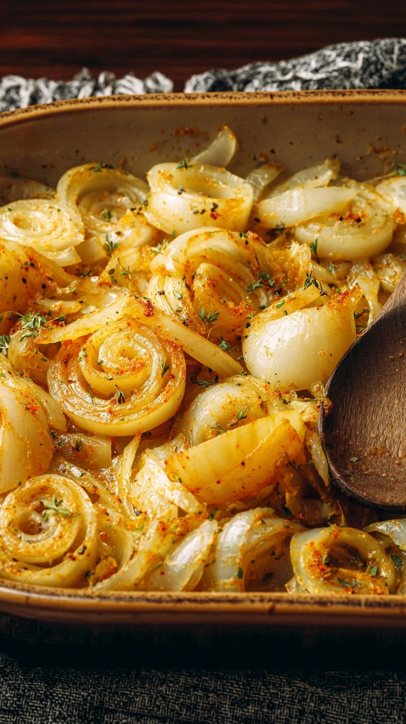 Arrange onion rings in overlapping layers in your prepared baking dish, seasoning each layer with salt, pepper, garlic powder, and smoked paprika. Drizzle the melted butter and broth evenly over the onions, ensuring every ring gets coated. This moisture combination prevents burning while promoting caramelization.