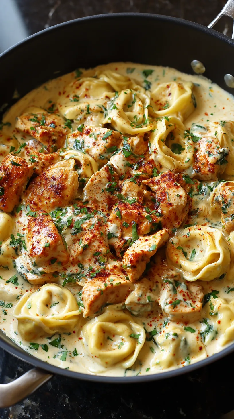 Return chicken to the skillet along with drained tortellini, bell pepper, and sun-dried tomatoes. Toss gently, adding pasta water as needed for desired consistency. Season with Italian seasoning, red pepper flakes, salt, and white pepper.