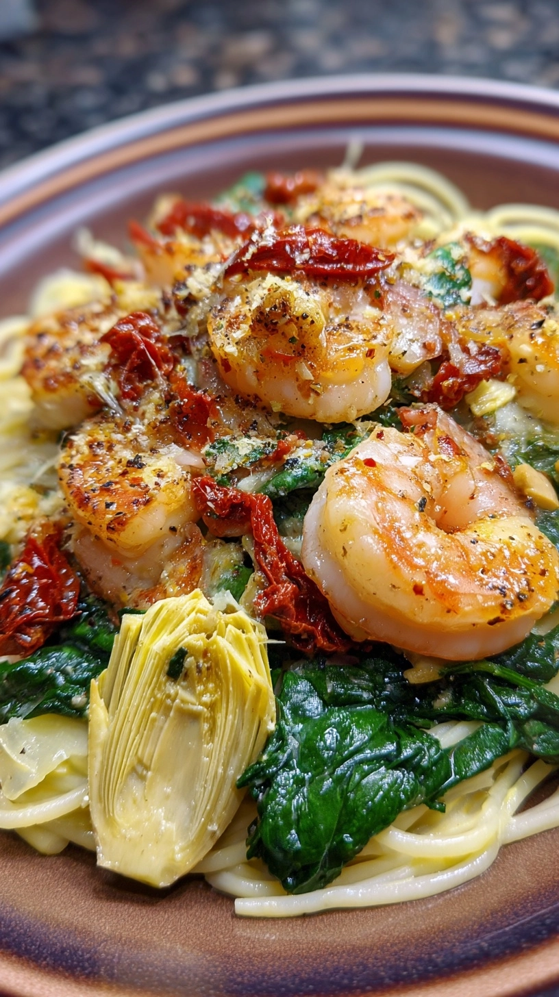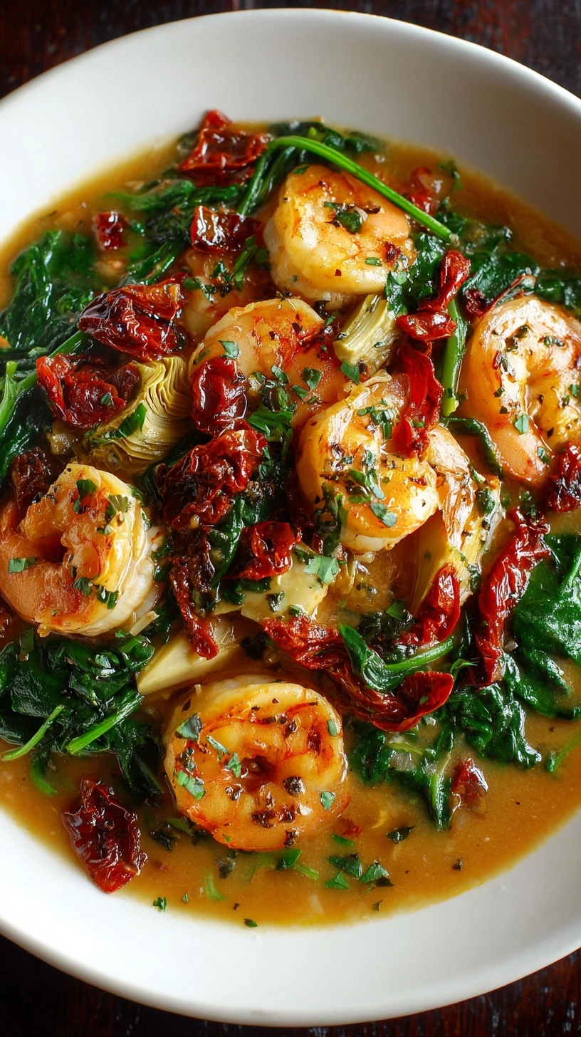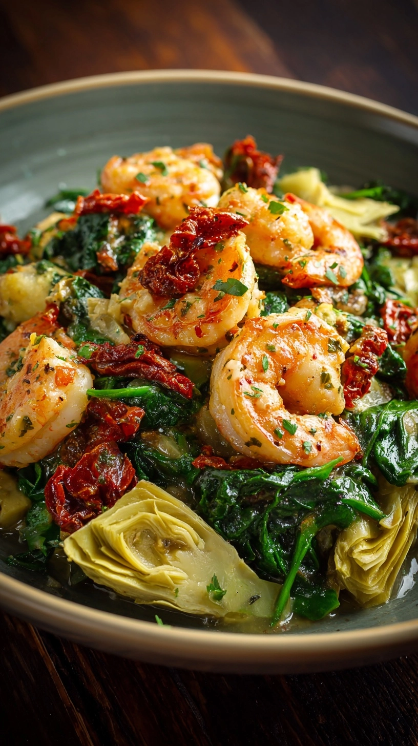 Serve this elegant Tuscan Shrimp with Spinach, Artichokes, Sun-Dried Tomatoes over creamy risotto, garlic-infused linguine, or cauliflower rice for varied dietary preferences. Create an impressive dinner party presentation by serving in individual cast-iron skillets with crusty sourdough bread for sauce-sopping. For a complete Mediterranean experience, pair with a simple arugula salad dressed with lemon vinaigrette and roasted pine nuts. The dish also works beautifully as a filling for stuffed portobello mushrooms or as a topping for polenta.