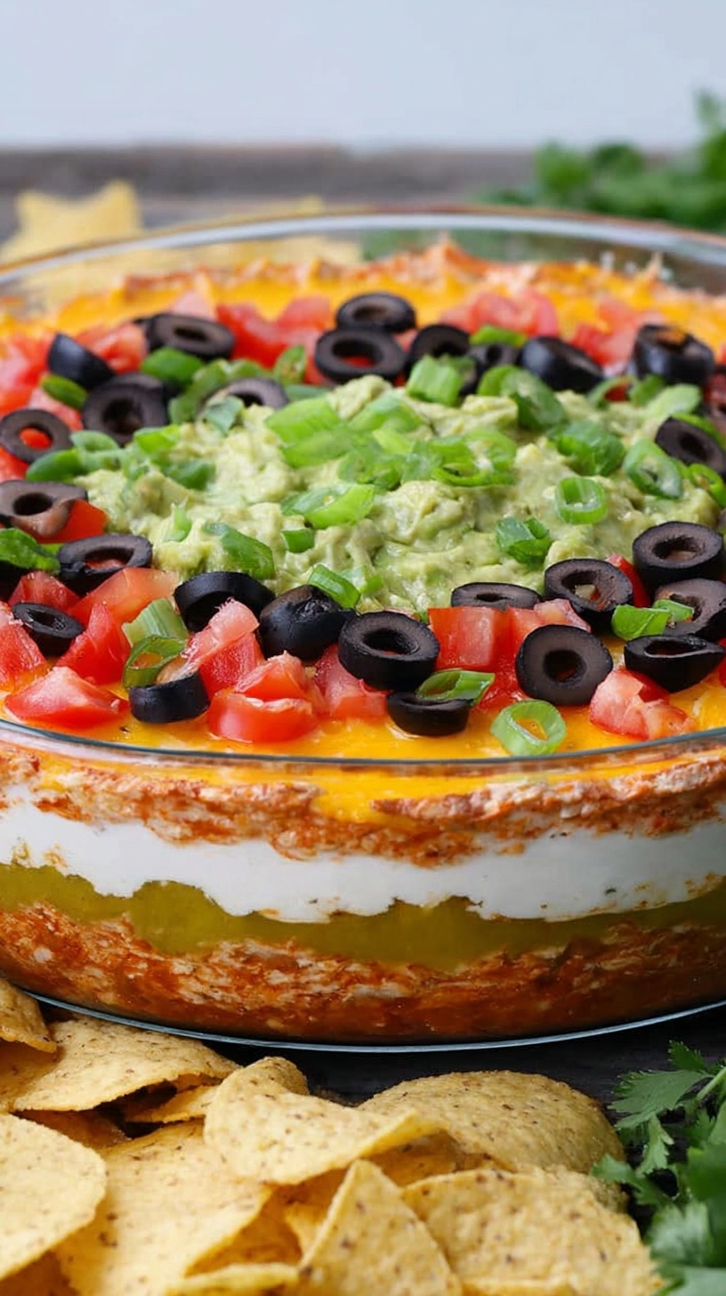 Present your Ultimate 7 Layer Dip with style and substance. Tortilla chips remain the classic choice, but consider offering baked pita triangles, vegetable chips, or colorful bell pepper strips for variety. Create an interactive station with different chip options and small spoons for those preferring to eat it as a salad. Warm corn tortillas cut into triangles and lightly toasted provide an elevated option. For formal gatherings, serve in individual mason jars – layer components in small jars for personalized portions that look Instagram-worthy while preventing double-dipping concerns.